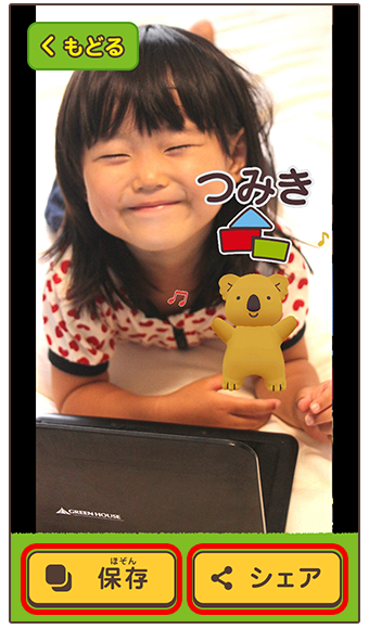 撮った写真は左下の「保存」ボタンからカメラロールに保存したり、右下の「シェア」ボタンからSNSにシェアすることができます。